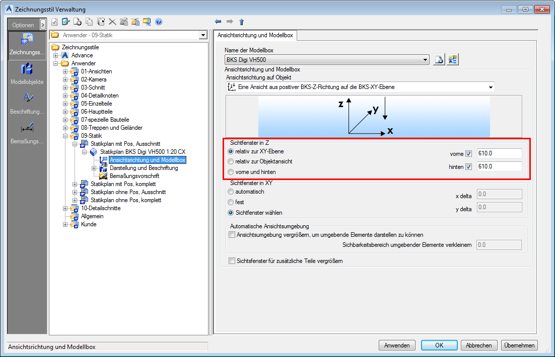 - Die Registerkarte Ansichtsrichtung und Modellbox wird geöffnet. Hier werden die Parameter des Z-Ansichtsfensters angezeigt.