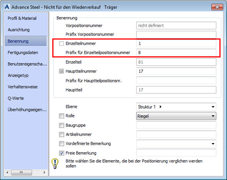 - Registerkarte Nummer: Wählen Sie Einzelteilnummer und geben Sie 1 ein; wählen Sie Präfix und geben Sie B ein.