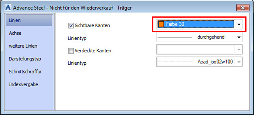 - Ändern Sie die Farbe unter Sichtbare Kanten beispielsweise in Orange (Farbe 30) und drücken Sie die EINGABETASTE.