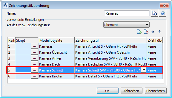 - Wechseln Sie im Fenster Prozessmanager zu Anwender > Prozesse > Kameras > Selected Cameras PageFull ANSI-E. Wählen Sie auf der Registerkarte Hauptdefinition > Abschnitt Zeichnungsstile die Option Kameras aus der Dropdown-Liste.