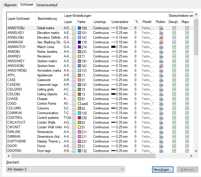 Zu jedem Layer-Standard gibt es einen passenden Layer-Schlüsselstil. Die Layer-Schlüssel in dem Layer-Schlüsselstil ordnen vordefinierten Layern mit Namen, die dem Layer-Standard entsprechen, bestimmte Objekte zu. Wenn Sie ein Objekt hinzufügen, wird dieses Objekt automatisch auf dem im aktuellen Layer-Schlüsselstil zugeordneten Layer gezeichnet. Dieses Verfahren nennt man Layer-Zuordnung.