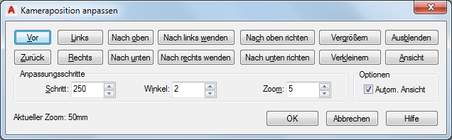 Mit jedem Klicken auf eine Schaltfläche ändert sich die Ansicht in den Schritten, die die Werte im Bereich Anpassungsschritte bestimmen. Wenn Autom. Ansicht aktiviert ist, können Sie die Änderung bei jedem Klick auf eine Schaltfläche sehen. Bei deaktivierter Option Autom. Ansicht müssen Sie auf Ansicht klicken, um die Änderungen zu sehen.