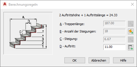 Während einige der zueinander gehörenden Abmessungswerte vom Benutzer festgelegt werden können, werden andere wiederum automatisch eingestellt. Dies hängt von der Kombination der gewählten Felder ab. Wenn die Berechnung auf der Grundlage bestimmter Regeln erfolgen soll, sind nur logische Wertekombinationen möglich. Ist der regelbasierte Rechner nicht aktiviert, kann entweder die Auftritts- oder die Treppenlänge bzw. entweder die Anzahl der Steigungen oder die Steigungshöhe vom Benutzer festgelegt werden.
