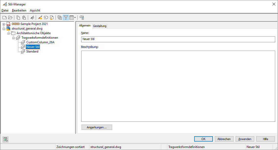 Im Stil-Manager wird der Ordner Architektonische Objekte geöffnet und Tragwerksformdefinitionen ausgewählt.