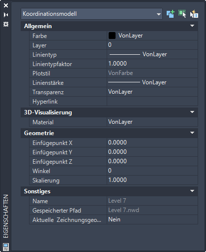 Um die Palette Eigenschaften anzuzeigen, doppelklicken Sie auf das Koordinationsmodell oder den Begrenzungsrahmen um das Modell.