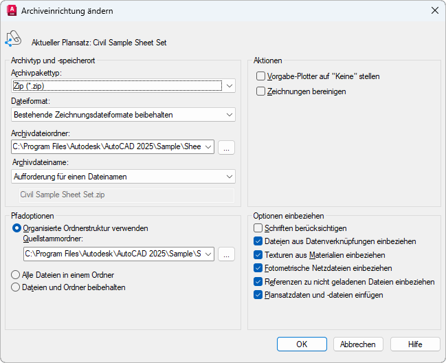 Ändert die Pfade, die Vorgabeformate, die Organisation und andere Einstellungen für einen archivierten Plansatz.