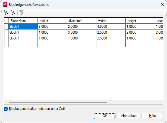 Im Dialogfeld Blockeigenschaftentabelle sind die Spaltenüberschriften Parameter, während die Zeilen die Eigenschaftensatzwerte definieren. Eine ausgewählte Blockreferenz kann auf die definierten Werte eingestellt werden. Jede Blockdefinition kann eine Tabelle enthalten.