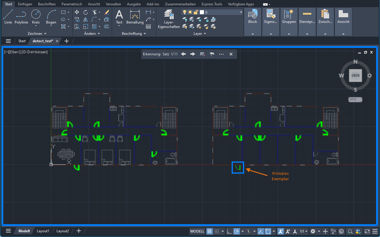 Im Überprüfungsmodus wird der Werkzeugkasten Erkennung oben im Zeichenfenster angezeigt. Dieser Werkzeugkasten enthält verschiedene Optionen zum Navigieren und Verwalten von Erkennungsergebnissen. Die Erkennungsergebnisse werden in Gruppen ähnlicher Objekte gruppiert. Ein Satz stellt eine Gruppe ähnlicher erkannter Objekte dar, die in Instanzen eines einzelnen Blocks konvertiert werden können.