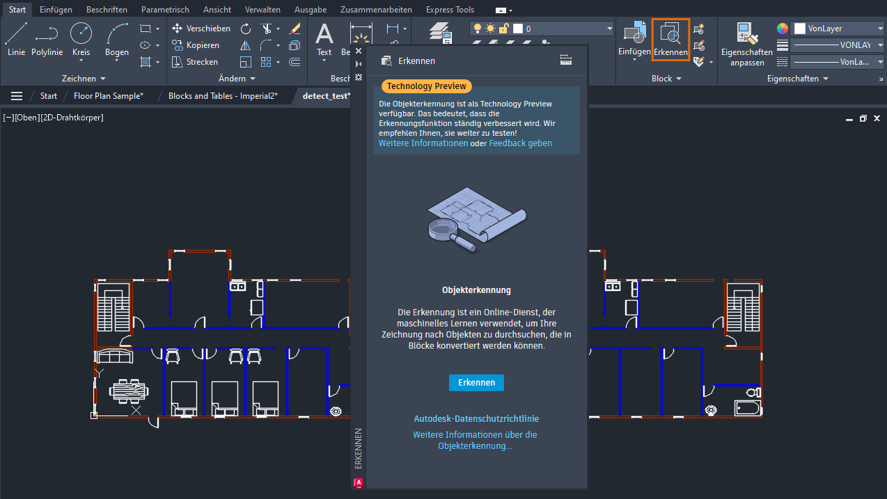 AutoCAD 2025 enthält eine Technology Preview, die maschinelles Lernen verwendet, um Ihre Zeichnung zu scannen und Objekte zu ermitteln, die in Blöcke konvertiert werden können.