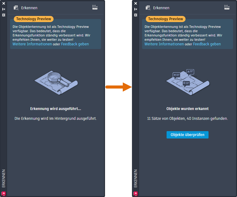 Wenn Sie die Objekterkennung starten, wird die Geometrie der Zeichnung zur Erkennung an den AutoCAD-Dienst für maschinelles Lernen gesendet. Nachdem der Dienst die Zeichnung analysiert hat, werden Sie von der Palette benachrichtigt, ob Objekte gefunden wurden, die in Blöcke konvertiert werden können. Klicken Sie auf Objekte überprüfen, um die ermittelten Instanzen weiter zu prüfen und zu bewerten.