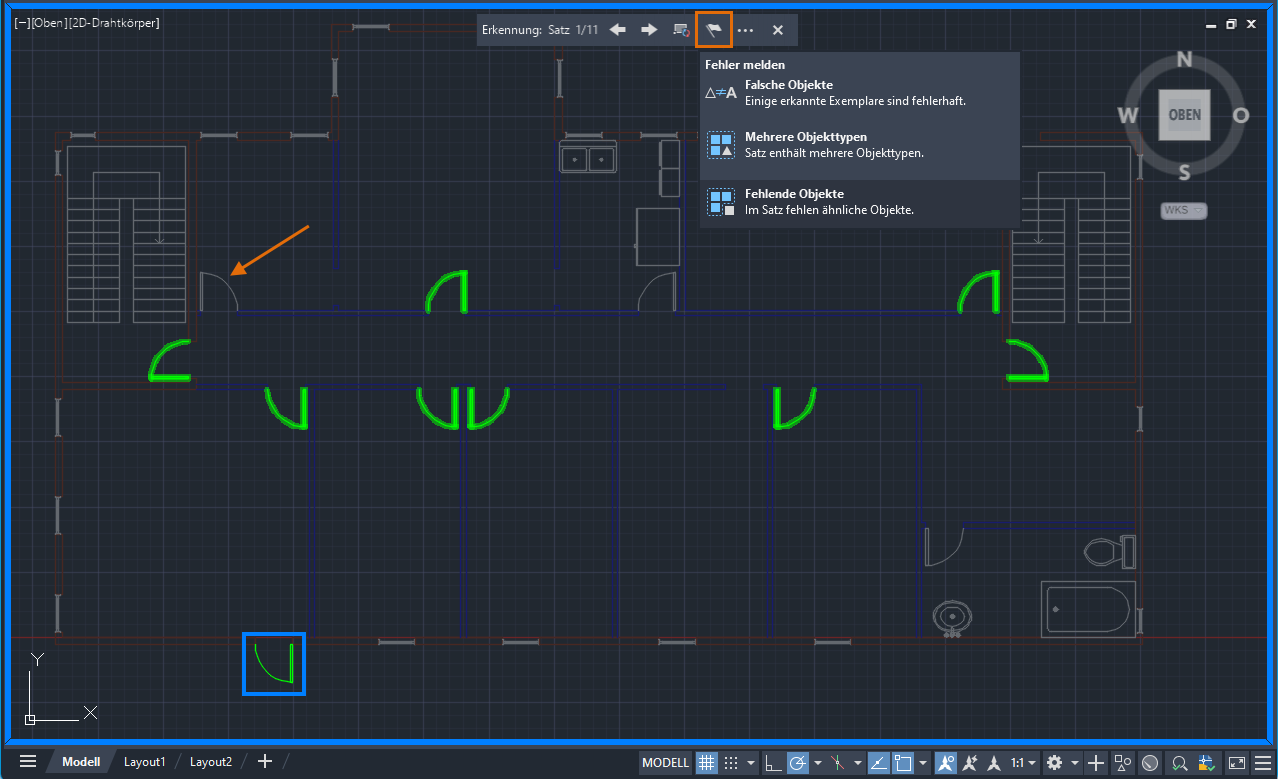 - Die Objekterkennung wurde für Zeichnungen in der Draufsicht konzipiert. Derzeit eignet sich die Erkennung am besten zur Identifizierung architektonischer Objekte, obwohl möglicherweise in dieser Version nicht alle architektonischen Objekte korrekt erkannt werden.