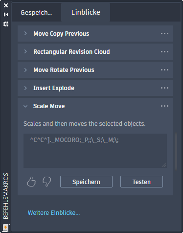 Speichern – Fügt den Makro-Einblick als Befehlsmakro zur Registerkarte Gespeichert hinzu, von wo aus dieses verwendet werden kann.