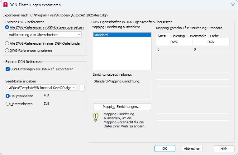 Standard ist die vorgabemäßige Mapping-Einrichtung, die Daten aus der exportierten Zeichnung extrahiert und ein automatisches Mapping für DGN-Layer, Linientypen, Linienstärken und Farben, wie in der Mapping-Voransicht angezeigt, verwendet.