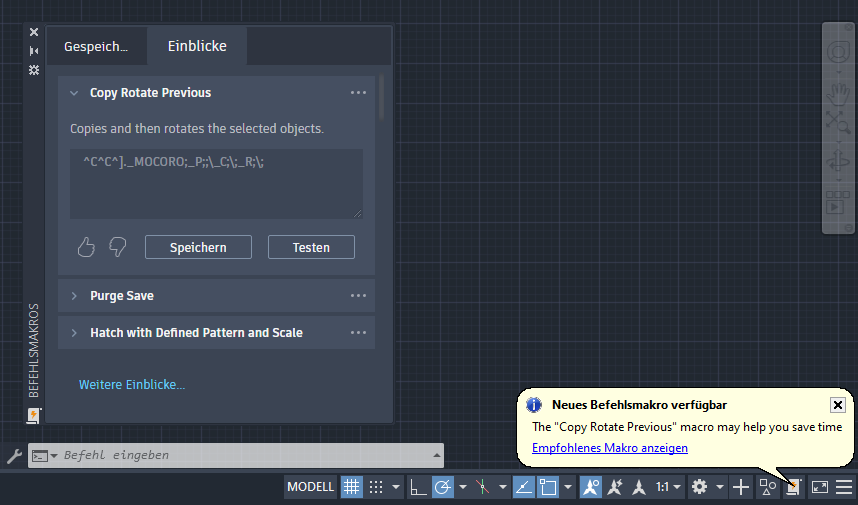 Diese Einblicke basieren auf der Häufigkeit, mit der Sie bestimmte Befehlsfolgen verwenden, und werden im Produkt erstellt und zur Verfügung gestellt. Wenn Sie beispielsweise Objekte mit dem Befehl KOPIEREN kopieren und dann mit dem Befehl DREHEN drehen möchten, würden Sie die Befehlsfolge KOPIEREN,DREHEN verwenden. Wenn Sie im Produkt Befehle verwenden, werden Ihre Befehlsfolgen auf eine mögliche Empfehlung für ein passendes Befehlsmakro hin überprüft.