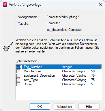 Zeigt alle Felder an, die für die aktuelle Datenbanktabelle zur Verfügung stehen, außerdem den Feldtyp sowie (bei alphanumerischen Feldern) die Feldlänge. Um ein Schlüsselfeld für die Verknüpfungsvorlage festzulegen, aktivieren Sie das Kontrollkästchen links neben dem gewünschten Feldnamen.