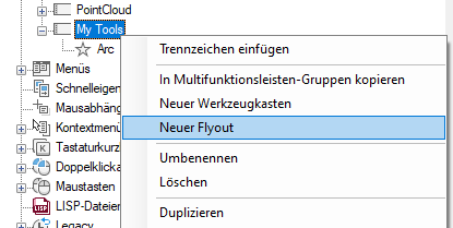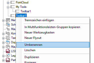 Ein neuer Werkzeugkasten (Werkzeugkasten1) wird erstellt, und ein neues Flyout, das den Werkzeugkasten referenziert, wird unten im ausgewählten Werkzeugkasten platziert.