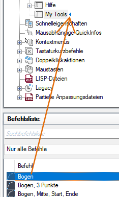 Ziehen Sie im Bereich Befehlsliste einen Befehl in das Pulldown-Menü oder eine Position unter dem Pulldown-Menü im Bereich Anpassungen in <Dateiname>.