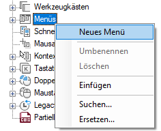 Klicken Sie auf der Registerkarte Anpassen im Bereich Anpassungen in <Dateiname> mit der rechten Maustaste auf den Knoten Menüs. Klicken Sie auf Neues Menü.