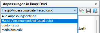 1. Wählen Sie auf der Registerkarte Anpassen im Bereich Anpassungen in <Dateiname> die Haupt-CUI-Datei (<Anpassungsdateiname>.cuix) aus der Dropdown-Liste aus.