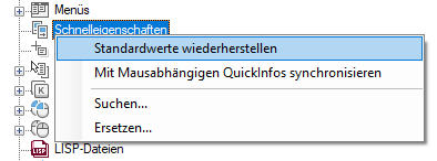 - Klicken Sie auf der Registerkarte Anpassen im Bereich Anpassungen in <Dateiname> mit der rechten Maustaste auf Schnelleigenschaften.