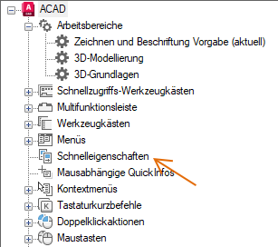 - Wählen Sie auf der Registerkarte Anpassen im Bereich Anpassungen in <Dateiname> die Option Schnelleigenschaften.