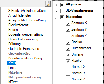 - Wählen Sie im Bereich Eigenschaften die Eigenschaften aus, die für einen Objekttyp in der Schnelleigenschaftenpalette angezeigt werden sollen.