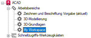 - Klicken Sie auf der Registerkarte Anpassen im Bereich Anpassungen in <Dateiname> auf das Pluszeichen (+) neben dem Knoten Arbeitsbereiche, um ihn zu erweitern.