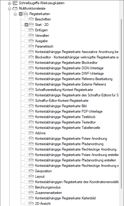 - Klicken Sie im Bereich Arbeitsbereichsinhalte auf das Pluszeichen (+) neben dem Knoten Multifunktionsleisten-Registerkarten, um ihn zu erweitern.