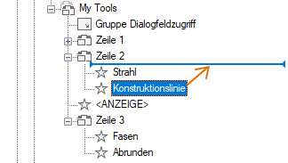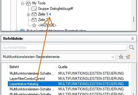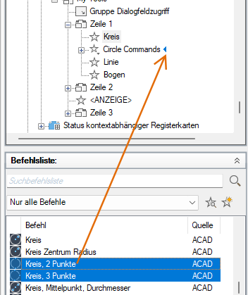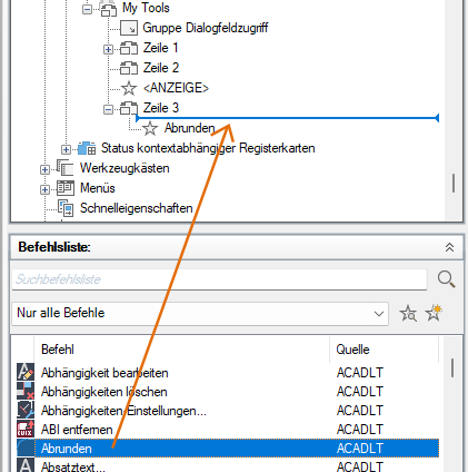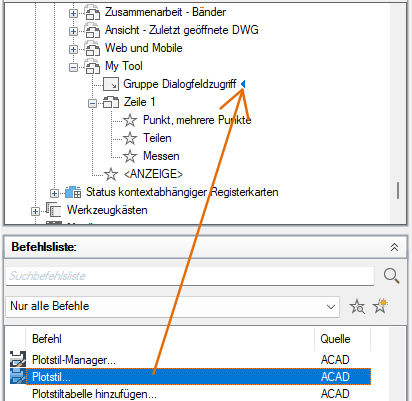 - Ziehen Sie einen Befehl aus der Befehlsliste in eine Zeile, eine untergeordnete Gruppe oder ein Dropdown-Menü der Gruppe.