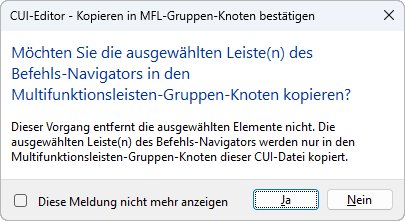 - Klicken Sie im Dialogfeld CUI-Editor - Kopieren in Multifunktionsleisten-Gruppen-Knoten bestätigen auf Ja.