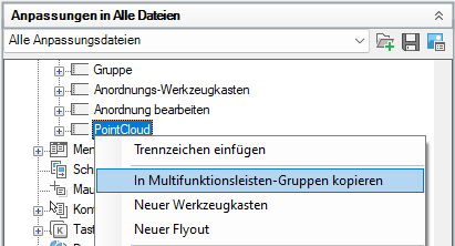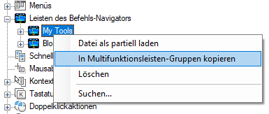 - Klicken Sie mit der rechten Maustaste auf den Befehls-Navigator, den Sie kopieren und in eine Multifunktionsleisten-Gruppe konvertieren möchten. Klicken Sie auf In Multifunktionsleisten-Gruppen kopieren.
