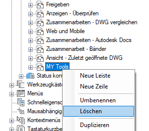 Achtung: Es gibt keine Möglichkeit, das Entfernen einer Multifunktionsleisten-Gruppe rückgängig zu machen. Wenn Sie die falsche Multifunktionsleisten-Gruppe entfernen, klicken Sie auf Abbrechen, um den CUI-Editor zu schließen und die vorgenommenen Änderungen zu speichern. Dadurch gehen jedoch alle anderen möglicherweise vorgenommenen Änderungen verloren.