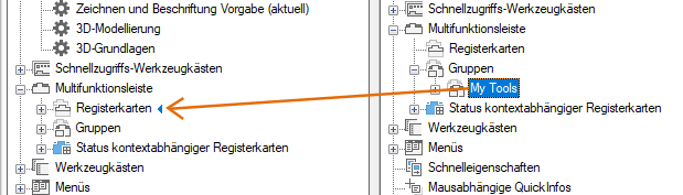 - Ziehen Sie die neue Multifunktionsleisten-Gruppe aus dem Bereich Anpassungen in <Dateiname> rechts vom Knoten Gruppen einer geladenen CUIx-Datei in den Bereich Anpassungen in <Dateiname> auf der linken Seite.