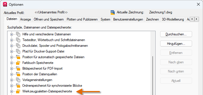Werkzeugpalettendateien enthalten standardmäßige und benutzerdefinierte Werkzeuge. Die Dateien sind an den Speicherorten abgelegt, die von der Einstellung Werkzeugpaletten-Dateispeicherorte angegeben werden.