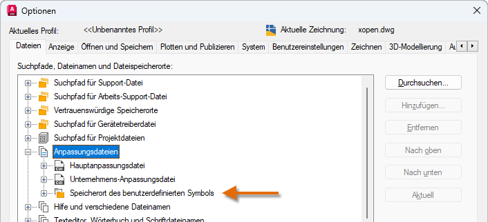 Benutzerprofile umfassen auch die Speicherorte, in denen das Programm nach Support-, Treiber-, Anpassungsdateien und anderen Dateien sucht. Wenn Ihre benutzerdefinierten Dateien nicht an den vorgabemäßigen Speicherorten abgelegt sind, werden die Pfade zu diesen Speicherorten migriert, die benutzerdefinierten Dateien selbst jedoch nicht. Migrieren Sie Ihre benutzerdefinierten Dateien mit den Optionen im Dienstprogramm Benutzerdefinierte Einstellungen migrieren, oder kopieren Sie die Dateien manuell zwischen den Speicherorten der früheren und der aktuellen Version des Programms.