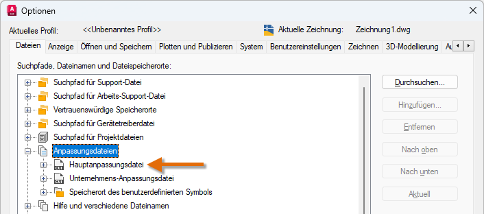 Benutzerprofile sind benannte Sammlungen von Einstellungen für die Anwendung und die Zeichnungsumgebung. Zu diesen Einstellungen gehören die Farbe des Zeichnungsfensters, die Cursorgröße, die Schriftart im Befehlszeilenfenster, das Wörterbuch für die Rechtschreibung usw.