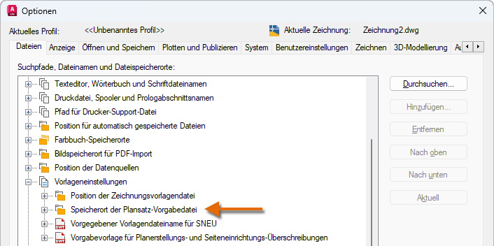 Zeichnungsvorlagendatei (DWT) werden zum Erstellen neuer Zeichnungen verwendet. Die anhand einer DWT-Datei erstellten Zeichnungen enthalten alle Stile und Zeichnungsobjekte, die in der DWT-Datei definiert sind. Die benutzerdefinierten DWT-Dateien aus der früheren Version werden in einen Unterordner mit dem Namen der Zielversion migriert; die Namenskonvention des Unterordners lautet Produktname Templates. Der Unterordner Produktname Templates wird unter dem Ordner erstellt, der in der Einstellung Position der Zeichnungsvorlagendatei definiert ist.