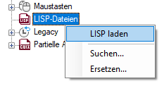 Klicken Sie im CUI-Editor auf der Registerkarte Anpassen im Bereich Anpassungen in <Dateiname> mit der rechten Maustaste auf den Knoten LISP-Dateien. Klicken Sie auf LISP laden.