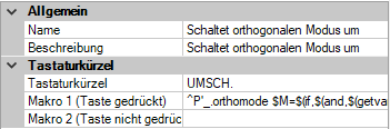 - Geben Sie im Feld Makro 2 (Taste nicht gedrückt) ein Makro ein, das ausgeführt werden soll, wenn die Taste für temporäre Überschreibung freigegeben wird. Wenn kein Wert definiert ist, werden die Anwendung und die Zeichnungseinstellungen wieder in ihren vorherigen Zustand zurückgesetzt (bevor die temporäre Überschreibung ausgeführt wurde), wenn die Taste freigegeben wird.