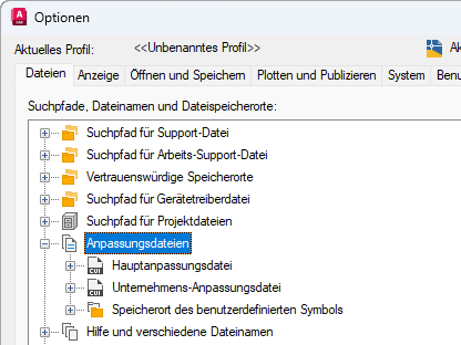 - Klicken Sie im Dialogfeld Optionen auf der Registerkarte Dateien auf das Pluszeichen (+) neben Anpassungsdateien, um den Knoten zu erweitern.