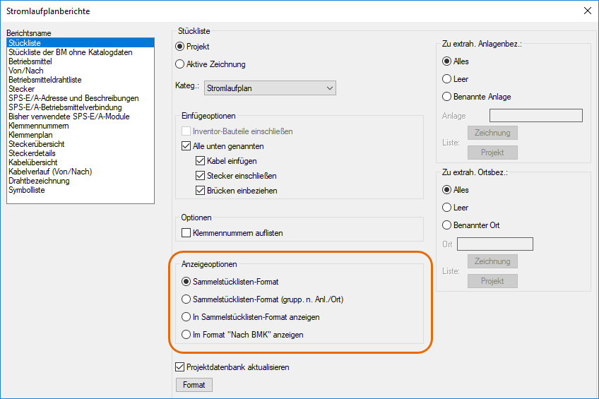 Wählen Sie im Dialogfeld Stromlaufplanberichte in der Berichtsliste die Option Stückliste aus.