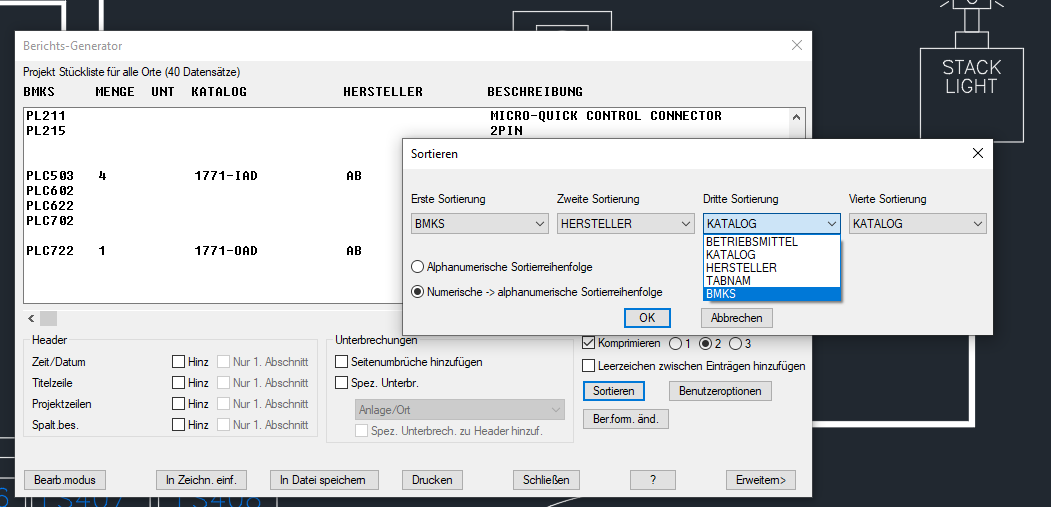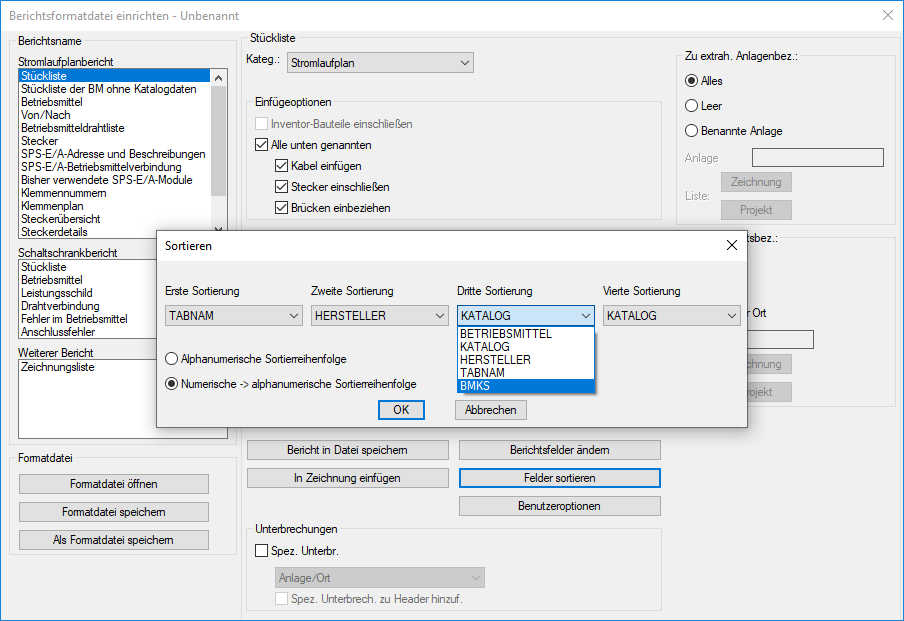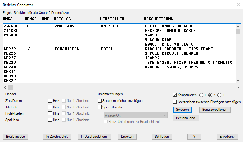 Der Stücklistenbericht bietet jetzt eine verbesserte Sortierfunktion nach BMK. So lässt sich die Organisation des Stücklistenberichts besser kontrollieren. Zusätzlich zu den vorhandenen Optionen für Stromlaufplan-, Schaltschrank- und automatische Berichte können Sie Stücklistenberichte jetzt nach BMK sortieren.