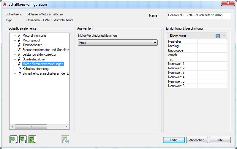 6. Wählen Sie im Abschnitt Schaltkreiselemente den Eintrag Motor-Klemmenverbindungen aus.