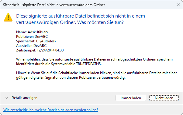 Beim Laden einer benutzerdefinierten Programmdatei, die digital signiert wurde, überprüft das AutoCAD-basierte Programm oder AutoCAD LT die digitale Signatur, die an die Datei angehängt ist. In einem Meldungsfeld wird angezeigt, ob die digitale Signatur überprüft werden konnte, mit der der Benutzer die Programmdatei in die Zeichnungsumgebung laden oder nicht laden kann.
