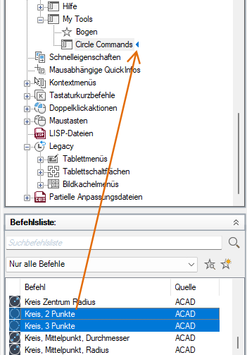 Ziehen Sie im Bereich Befehlsliste den Befehl, den Sie zum Untermenü hinzufügen möchten, in den Bereich Anpassungen in