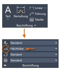 Der Name des aktuellen Bemaßungsstils, in diesem Fall Hitchhiker, wird auch in der Dropdown-Liste der Gruppe Beschriften angezeigt.