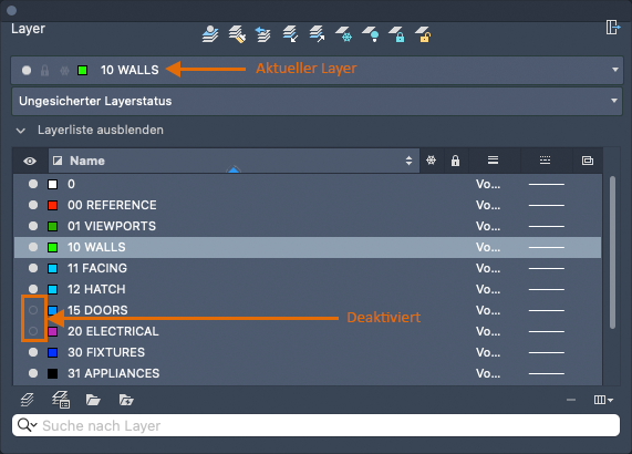 Beachten Sie in der Spalte Sichtbarkeit, dass die Kreissymbole für zwei Layer nicht ausgefüllt sind. Diese Layer wurden deaktiviert, um die Türen und Stromleitungen im Grundriss auszublenden.