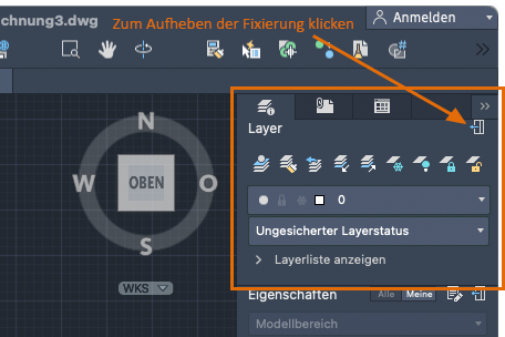 Um zu sehen, wie eine Zeichnung organisiert ist, verwenden Sie die Layer-Palette. Die Layer-Palette ist vorgabemäßig auf der rechten Seite über der Eigenschaftsprüfung fixiert. Heben Sie die Fixierung der Palette auf, um die Größe der Palette und der einzelnen Spalten in der Palette zu ändern.