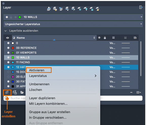Zum Erstellen eines Layers klicken Sie auf die dargestellte Schaltfläche und geben den Namen des neuen Layers ein. Um den aktuellen Layer zu ändern, doppelklicken Sie auf den Layernamen oder klicken mit der rechten Maustaste auf den Layernamen und wählen Aktivieren.