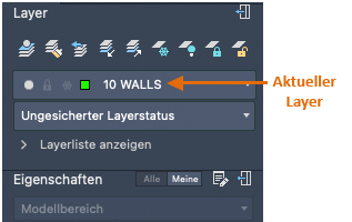 Wie angegeben, ist Layer 10 WALLS der aktuelle Layer. Alle neuen Objekte werden automatisch auf diesem Layer platziert.